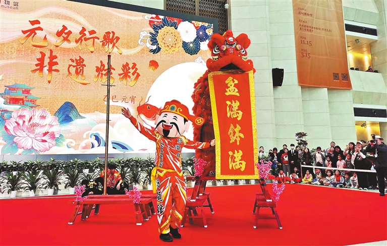 A performer dressed as the God of Wealth greets the audience during a lion dance show at the Shenzhen Museum’s History and Folk Culture Division in Futian District yesterday. The performance, presented by a troupe from Guangzhou, was part of the museum’s celebrations for the Lantern Festival. Nearly 1,000 audience members also enjoyed Beijing opera and Cantonese opera performances by Shenzhen troupes, as well as comedic shows and guided exhibitions at the museum, all while immersing themselves in a festive atmosphere of reunion and happiness. Cao Zhen |