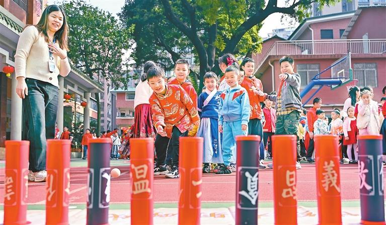 On the first day of the spring semester, students from Wende Road Primary School in Guangzhou, the capital of Guangdong Province, participated in a traditional ancient Chinese game resembling bowling, known as “Mushe.” Originating from the Tang Dynasty (618-907), this game involves players attempting to knock down 15 wooden pillars using wooden balls from a specified distance. Across Guangdong, all primary and middle school students returned to their campuses for the new semester Thursday. China News Service |