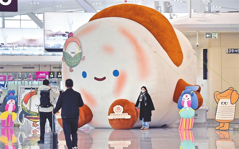 Passengers at the departure hall of the T5 terminal of Xi’an Xianyang International Airport are seen taking photos Thursday in front of an installation in the shape of a roujiamo, a beloved local snack reminiscent of a sandwich.