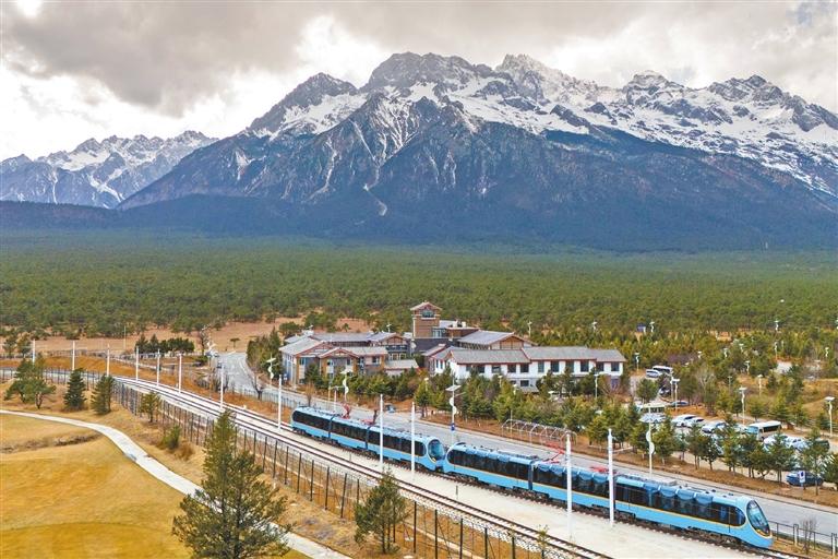 A sightseeing train is seen on its way to the majestic Jade Dragon Snow Mountain in Southwest China’s Yunnan Province on Tuesday.