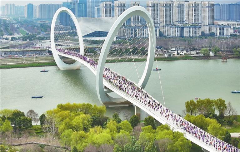 Runners cross the pedestrian bridge over the Yangtze River during the 2025 Nanjing Half Marathon, held yesterday in the capital of East China’s Jiangsu Province. The 21-kilometer route took 25,000 participants through some of the city’s most iconic landmarks, including the pedestrian bridge and a scenic trail on an islet in the middle of the Yangtze River. Xinhua |