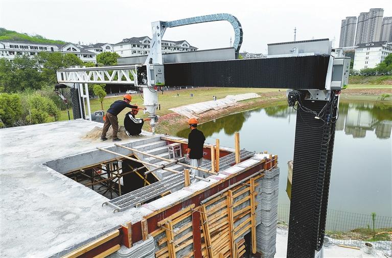 Researchers at China Three Gorges University in Yichang, Hubei Province, inspect their school-developed 12-meter gantry-style 3D printer in this aerial photo taken Tuesday. The team is using the printer to build an 8-meter-tall, two-story structure spanning 100 square meters. The main structure has been completed, and workers are now installing the sloped roof. The innovative printing technology has cut construction time by 70% compared to traditional methods. Xinhua |