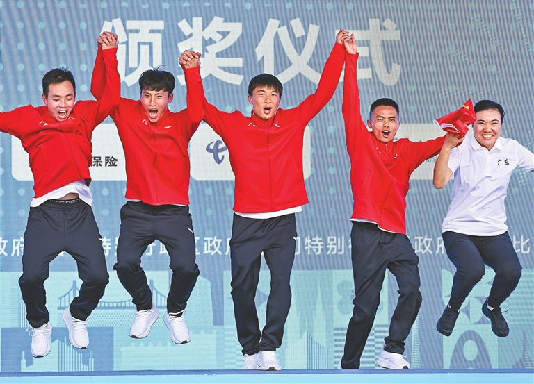 Members of the Guangdong team celebrate at the award ceremony after being crowned in the men’s orienteering relay race in Maoming City, Guangdong Province, on Thursday. This triumph marked the first gold medal of the mass competitions at the 15th National Games. In the subsequent women’s orienteering relay race, Guangdong also claimed the championship. The orienteering finals, which kicked off in Maoming on Thursday, are the first final event of the mass competitions of the 15 National Games and will run through Sunday. Orienteering is a sport that involves navigating through diverse terrain using a highly detailed map to locate a series of checkpoints. P3 >Xinhua |