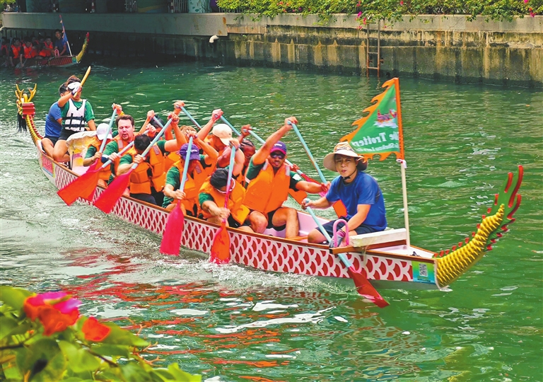 ? Members of the Globe Trotters team paddle in sync during the Shekou Dragon Boat Race on the Houhai Zhongxin River in Shekou on Saturday. The Globe Trotters team, which comprised expat residents from 10 countries, secured third place. Organized by the Shekou Management and Service Center for Expats, the race was held to celebrate the Dragon Boat Festival that falls on May 31 this year. It attracted 40 teams to participate. The Dragon Boat Festival, also known as the Duanwu Festival, is a traditional Chinese holiday celebrated on the fifth day of the fifth lunar month. It is rich in cultural significance and features a variety of unique traditions, including dragon boat racing and eating zongzi — glutinous rice dumplings wrapped in bamboo or reed leaves. Wei Jie |