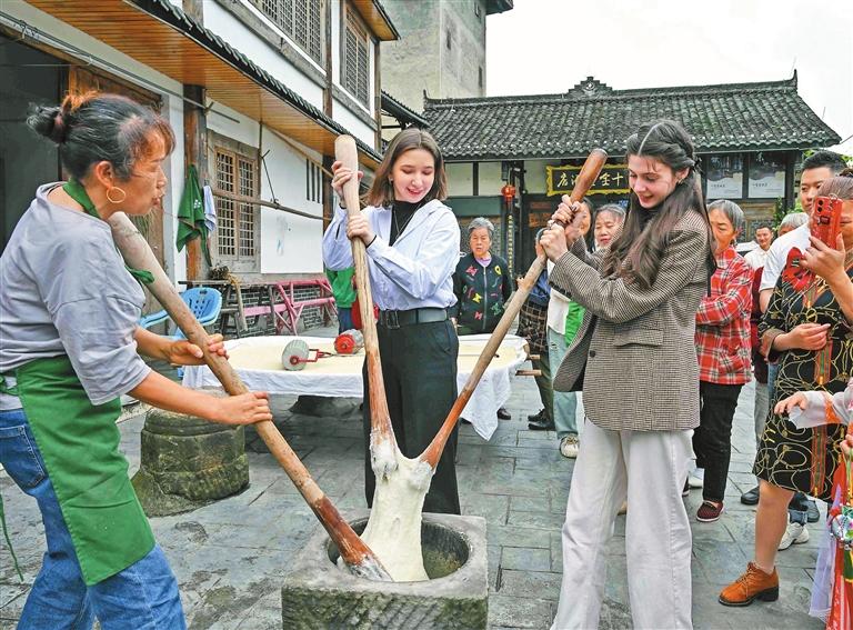 ? International students from Chongqing University join local residents in Ba’nan District, Chongqing Municipality, to make ciba (glutinous rice cakes) Wednesday. They were part of more than 200 expats and locals celebrating traditional Chinese customs ahead of the Dragon Boat Festival, which falls on Saturday. Ciba is a popular delicacy in southern China and a must-have treat during the festival for people in Sichuan Province. With a history of over 2,000 years, the Dragon Boat Festival is one of China’s most significant cultural events. Its customs include making and eating zongzi (glutinous rice dumplings), racing dragon boats, hanging mugwort and calamus to ward off evil, and drinking realgar wine, all of which symbolize cultural heritage and community bonds. P2 >Xinhua |