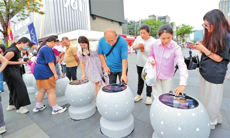 Since they were installed at a square in front of the Hold Land shopping mall in Dalang Subdistrict on May 25, these bollards have drawn crowds of young people eager to try the unique charging experience.