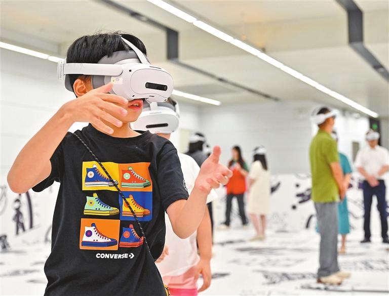 A boy wearing a VR headset gestures at the Future Reading Pavilion at the Guangzhou Library in Guangzhou, capital of Guangdong Province, on Thursday. The pavilion, which officially opened to the public on the same day, offers readers an immersive reading experience through VR technology.China News Service |