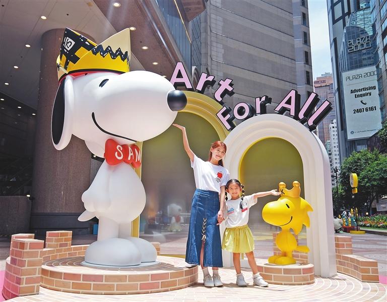 Visitors pose for a photo with a 3-meter-tall Snoopy at Times Square in Causeway Bay, Hong Kong, yesterday. The outsized beagle — one of several Snoopy creations by four artists — kicked off the “Art for All for Peanuts’ 75th Anniversary” celebration in Hong Kong. Running until Sept. 3, the event also features a pop-up store, offering an immersive Peanuts experience spanning art, culture, lifestyle, and cuisine. Peanuts’ 75th Anniversary is a yearlong, worldwide celebration marking 75 years since Charles M. Schulz first published the Peanuts comic strip in 1950. Hong Kong is its first stop in Asia. China News Service |
