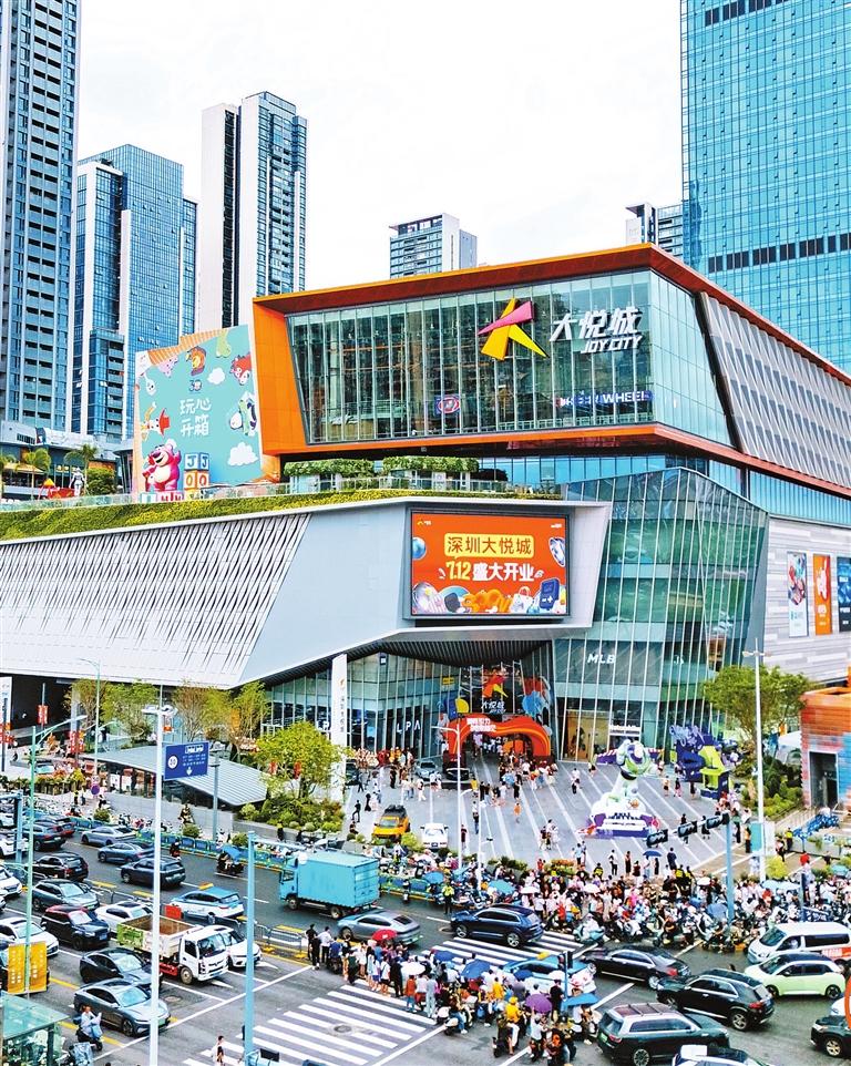 Throngs of shoppers are seen in front of the Shenzhen Joy City shopping mall in Bao’an District on its opening day Saturday. The 250,000-square-meter complex welcomed more than 420,000 visitors and logged nearly 20 million yuan (US$2.79 million) in sales volume, excluding Apple products and cars, on its opening day. Joy City — China Oil and Foodstuffs Corp.’s flagship retail brand — merges youth culture with high style. Since its 2007 debut, it has rolled out seven malls across six Chinese cities, with Shenzhen the newest addition. Shenzhen Economic Daily |
