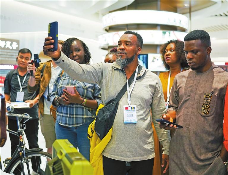 Visitors photograph exhibits during a tour of the New Media Building of Shenzhen News Group yesterday. The delegation — more than 30 media professionals from developing countries — came to learn from China’s rapid advances in digital storytelling and artificial intelligence as the global news industry pivots to video. The visit was part of the Seminar on Short Video Creation and Communication for Developing Countries, hosted by the Ministry of Commerce. P3 > Wang Haolan |