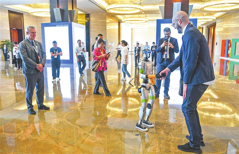 A professional attendee shakes hands with a humanoid robot at the China International Big Data Industry Expo 2025 in Guiyang, capital of Guizhou Province, on Thursday. The three?day event spotlights cutting?edge technologies and applications across digital infrastructure, AI large models, data security and smart terminals, and will open to the general public on Friday and Saturday. Xinhua |