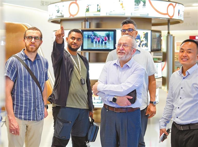 Leading a six-member delegation from Doha-based Al Jazeera Media Network, Mohammed Talal Abdulkarim (2nd R), with the network’s partnership, incubation, and planning, visits the Shenzhen News Group exhibition hall Thursday. The visitors met representatives from Shenzhen Daily, the group’s English?language paper, to discuss potential cooperation between the international broadcaster and Shenzhen?based news outlets. P3> Lin Jianping |