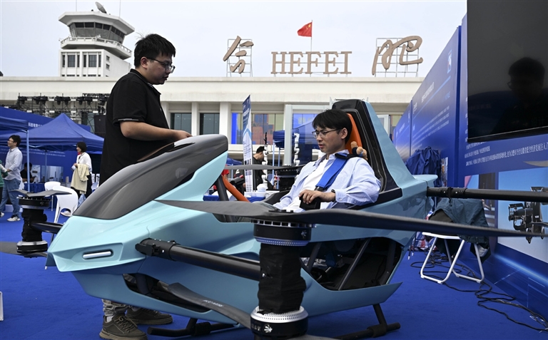 A visitor tests an unmanned flying motorcycle at the World Manufacturing Convention 2025 in Hefei on Sunday.
