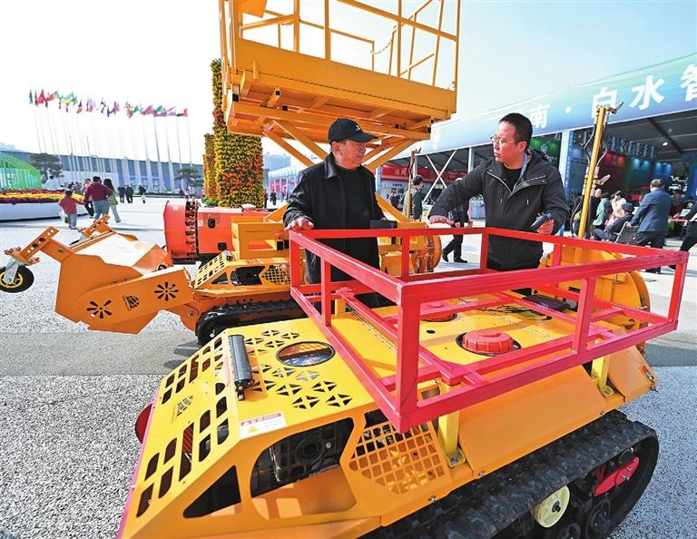 A visitor inquires about a crawler-type air-assisted sprayer on display at the 32nd Yangling Agricultural High-tech Fair on Oct. 26. The five-day event, held in the Yangling Demonstration Zone, Shaanxi Province, concluded yesterday, showcasing the latest agricultural innovations and fostering international cooperation.