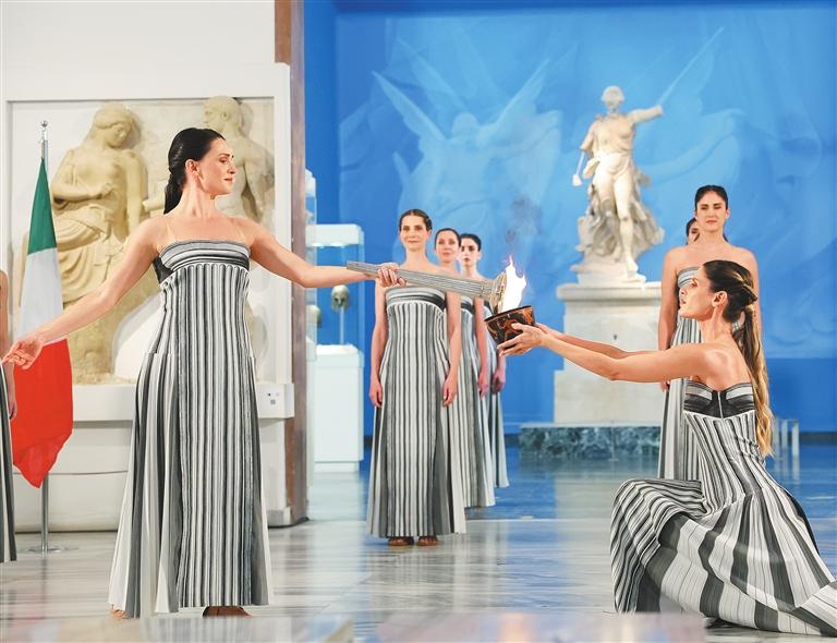 Actress Mary Mina (L), playing a priestess, lights a torch during the Olympic flame lighting ceremony for the Milan Cortina 2026 Winter Olympics at the Archaeological Museum of Olympia, Greece, yesterday. Bad weather lashing western Greece forced organizers to move the ceremony indoors, from Olympia’s ancient stadium and temples to the museum. The flame is lit by focusing the sun’s rays with a concave mirror. But with skies overcast, officials used a backup flame kindled during a brief spell of sunshine at Monday’s rehearsal.Xinhua |